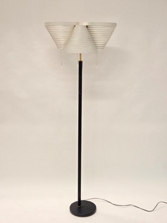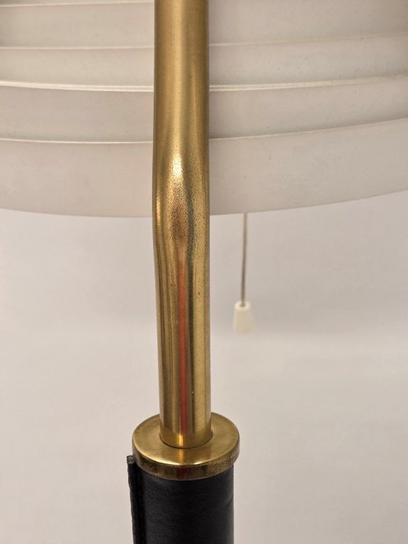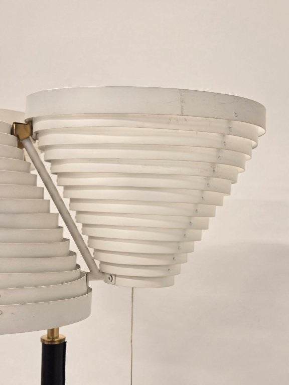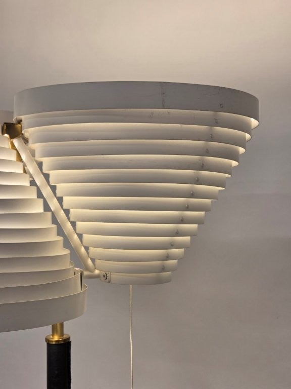 Artek A809 lattiavalaisin, valmistaja Valaisinpaja, suunnittelija Alvar Aalto. Valaisimessa on messinkinen jalka, mustalla nahalla, sekä valkoiset varjostimet. Valaisimessa on iän mukaista kulumaa.