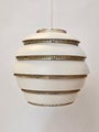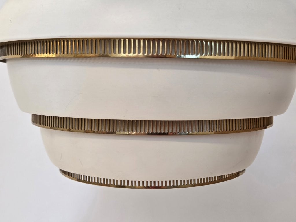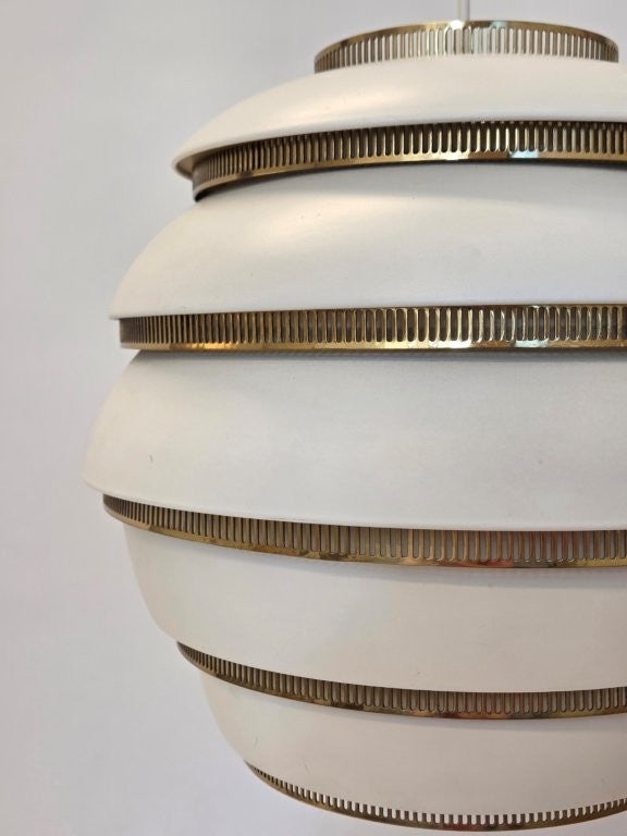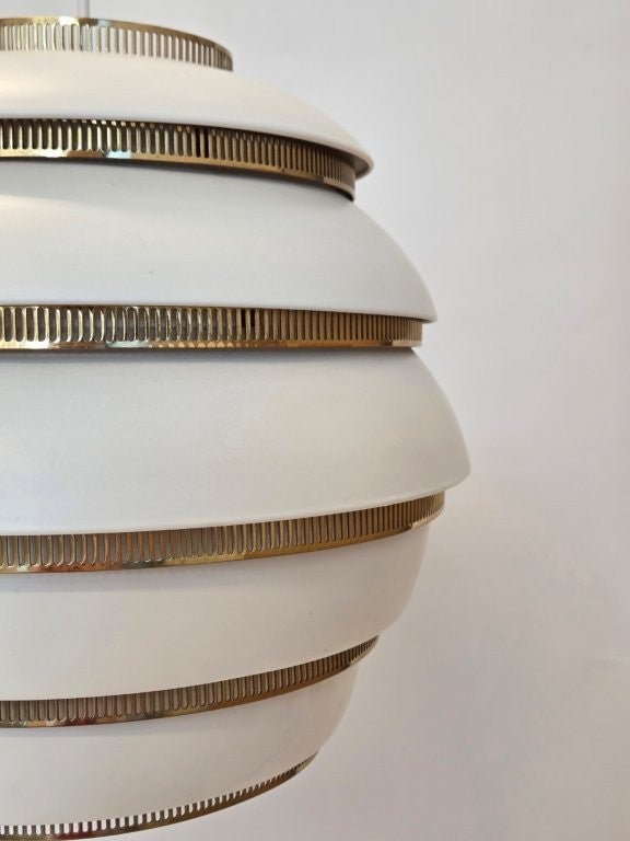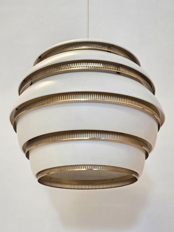 Artek A331 "Mehiläispesä" valaisin, valkoinen/messinki. Valmistaja Valaistustyö. Suunnittelija Alvar Aalto. Valaisin on hyvässä käytetyssä kunnossa.