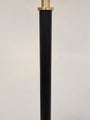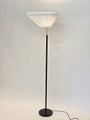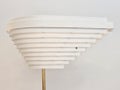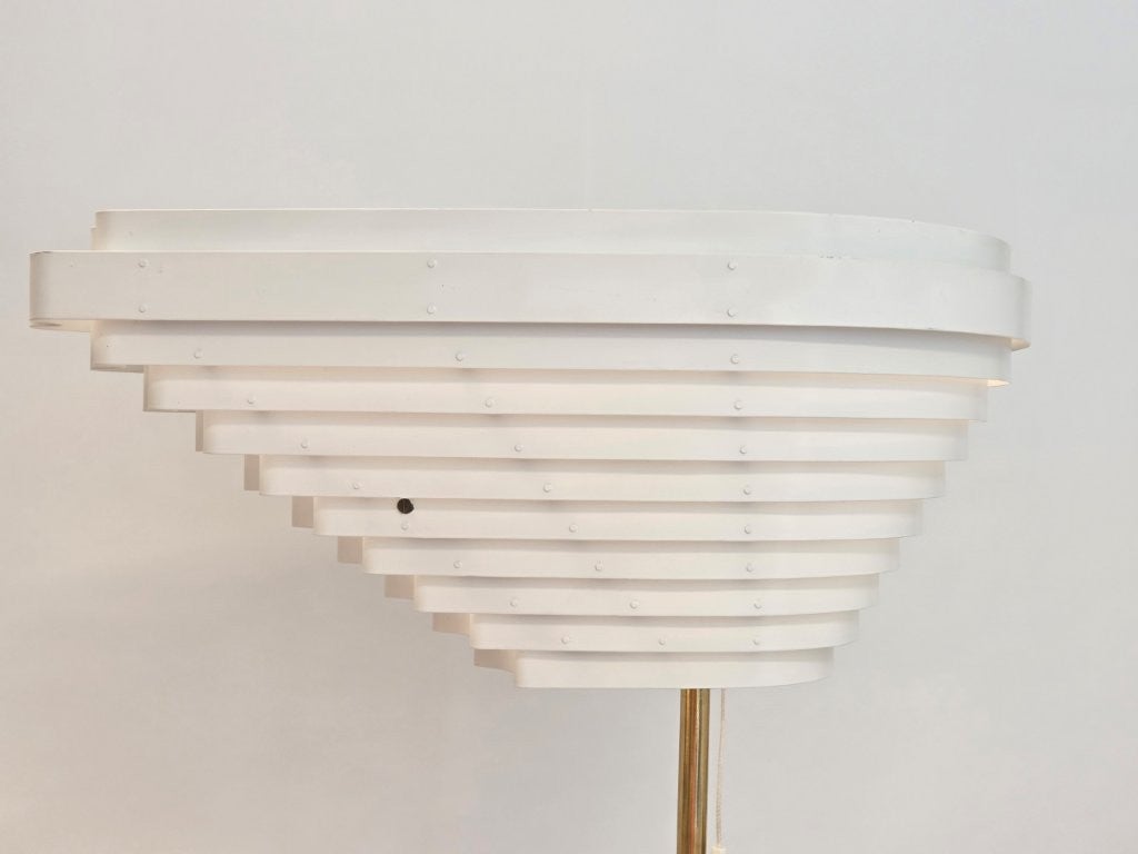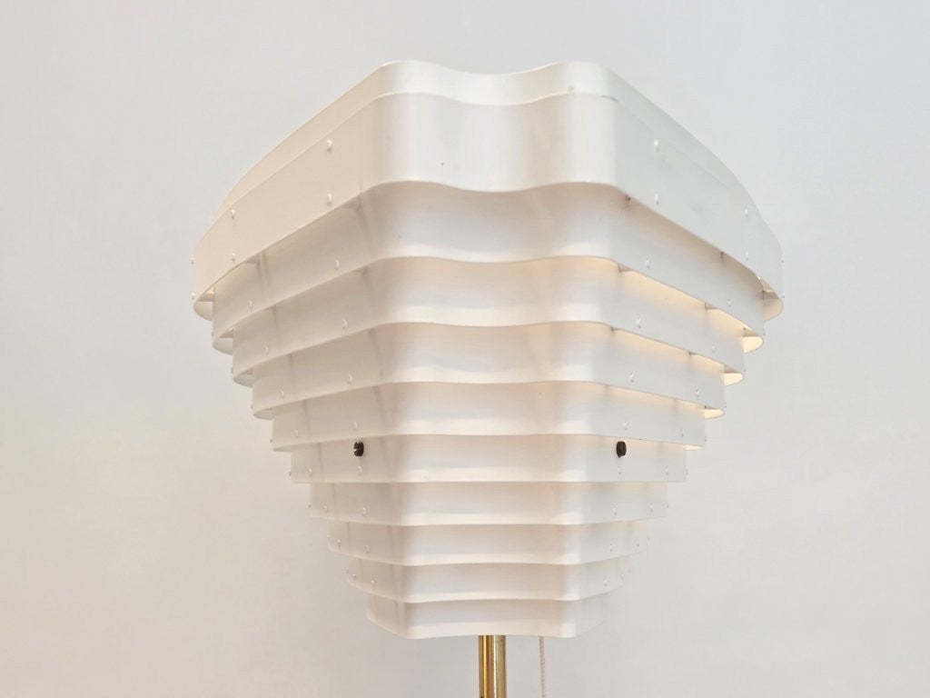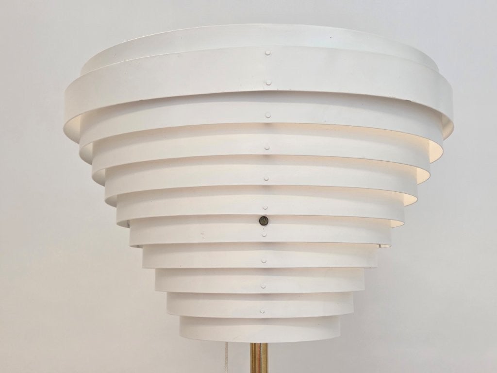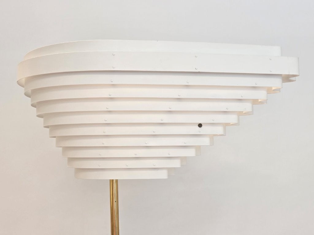 Artek A805 floor lamp "Angel's Wing", manufactured by Valaisinpaja, designed by Alvar Aalto. The lamp has a brass base, black leather, and a white shade. In good used condition.